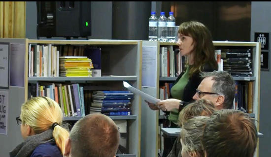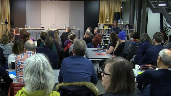 Publikum fylte biblioteket på Aust-Lofoten videregående skole. Skjermdump NRK.
